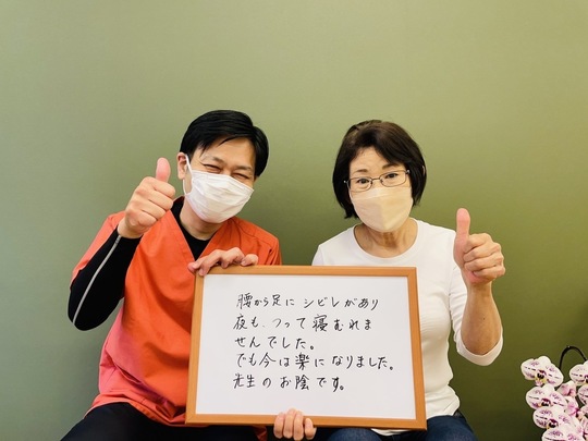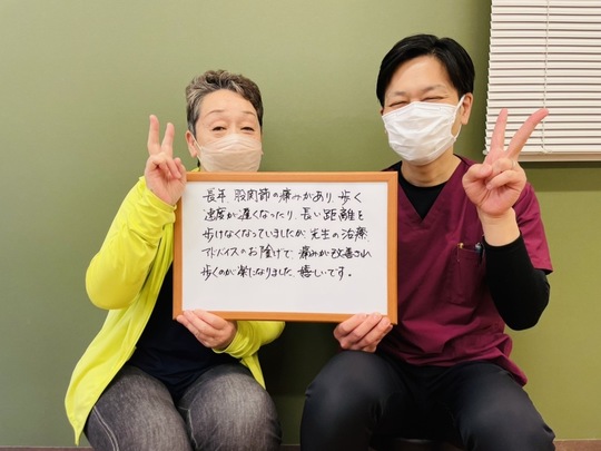 先生の治療や歩き方のご指導や日常生活のアドバイスのお陰で、痛みが改善され歩くのが楽になりました。