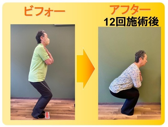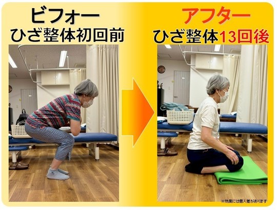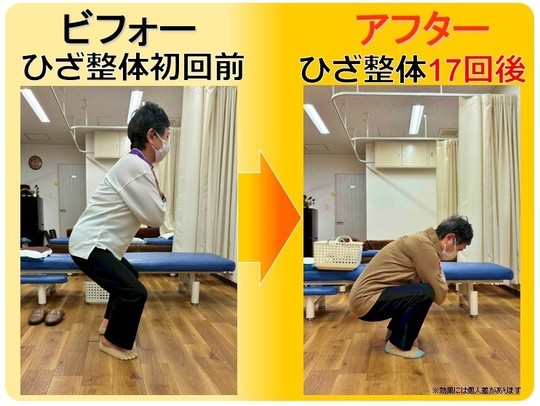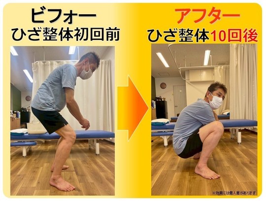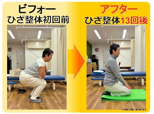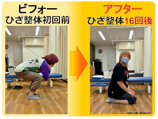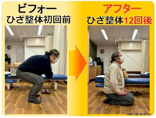 初回のお試し治療で効果を感じたので、二回目から膝整体の本治療に。2ヶ月ですっかりしゃがめるようになり、スムーズな歩行が可能に。